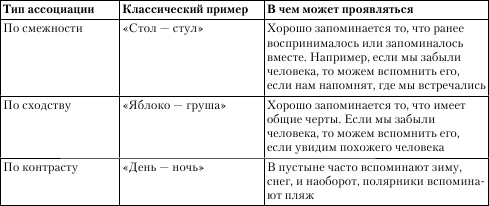 Впервые на важную роль ассоциаций в процессах памяти указывал еще Аристотель. Он же обозначил основные виды ассоциаций. Связь этих разновидностей ассоциативных явлений с процессами запоминания отображена в табл. 8.2.