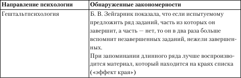 Таблица 8.3. Закономерности работы памяти, выявленные в рамках различных направлений психологии