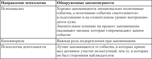 Различные направления психологии внесли свой вклад в понимание процессов памяти. Эти закономерности представлены в табл. 8.3.