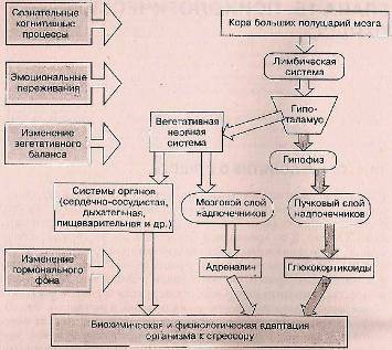 человека при стрессе. Темными стрелками показаны процессы, которые