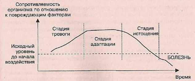 На первом этапе стресса организм сталкивается с неким возмущающим фактором среды и старается приспособиться к нему, на втором этапе происходит адаптация к новым условиям, но если стрессор продолжает действовать длительное время, то происходит истощение гормональных ресурсов и срыв систем адаптации, в результате чего процесс принимает патологический характер и может завершиться болезнью или смертью индивида.