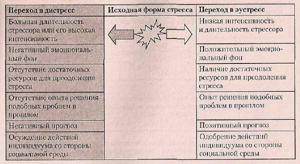 Селье выделил две формы стресса: полезную — эустресс, и вредоносную — дистресс. Таким образом, стресс может быть и полезным, и в этом случае он «тонизирует» работу организма и способствует мобилизации защитных сил (включая иммунную систему). Существует ряд факторов, которые могут способствовать переведению начального «неопределенного» стресса в негативную или позитивную форму (табл. 15.1).
