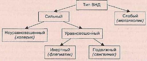 По мнению русского физиолога И. П. Павлова, темперамент человека (как, впрочем, и животных) всецело зависит от свойств нервной си темы организма. Он выделил три основных свойства нервной системы: илу, уравновешенность и подвижность (рис. 21.1). В зависимости от сочетания данных свойств он выделил несколько типов высшей нервной деятельности человека.