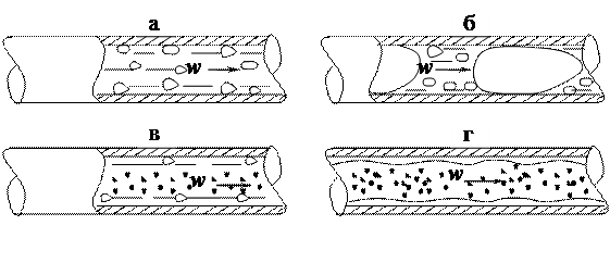 на шероховатостях поверхности трубы начинают формироваться пузырьки, которые, отрываясь от поверхности, переносятся в основной поток (рис., а), как и при пузырьковом режиме кипения в большом объеме. Этот режим называют пузырьковым режимом кипения. По мере возрастания объемной доли пара отдельные пузырьки сливаются и образуется пробка (снаряд) пара (рис., б), занимающая почти все сечение трубы. Этот режим называют снарядным режимом. Объемная доля пара может достигать 50 %, и скорость течения жидкости значительно возрастает. На стенках трубы продолжается процесс кипения с образованием пузырьков пара.