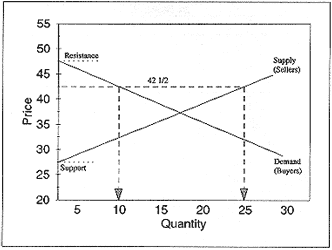 При любой цене график спроса/предложения (см. рис. 12) показывает, сколько имеется продавцов и покупателей. Так, по этому графику видно, что при цене 42,5 будет 10 покупателей и 25 продавцов Поддержка возникает на уровне, где линия предложения касается левого края графика (в данном случае 27,5). Цены не могут упасть ниже этой отметки, так как нет желающих продавать по такой цене. Спрос сопротивление появляется на уровне, где левого края касается линия спроса (в данном примере 47,5). Цены не могут подняться выше этой отметки, так как нет желающих покупать по такой цене.