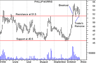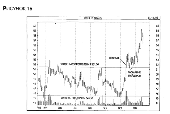 Рассмотрим ценовой прорыв на графике курса акций компании Phillip Morris (см. рис. 13). Заметьте, что за прорывом последовала коррекция: цены вернулись к уровню сопротивления.