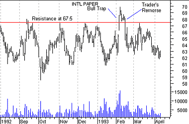 В первом случае, то есть когда вслед за «раскаянием» трейдеры приходят к единодушному выводу о необоснованности более высокой цены, возникает типичная «ловушка для быков» (или ложный прорыв). Как видно из рисунка 14, цены прорвали сопротивление на уровне 67,50 долл. (поманив за собой стадо быков, надеющихся на продолжение подъема), а затем вновь опустились ниже уровня сопротивления, оставив быков с акциями по завышенным ценам. По аналогичной психологической схеме образуется и ловушка для медведей. Цены держатся ниже прорванного уровня поддержки достаточно долго, чтобы убедить медведей в целесообразности продажи