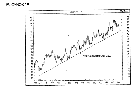Как видно из рисунка 19, восходящая тенденция характеризуется последовательным повышением минимальных цен. Ее можно рассматривать как восходящий уровень поддержки: тон задают быки, толкающие цены вверх.