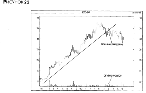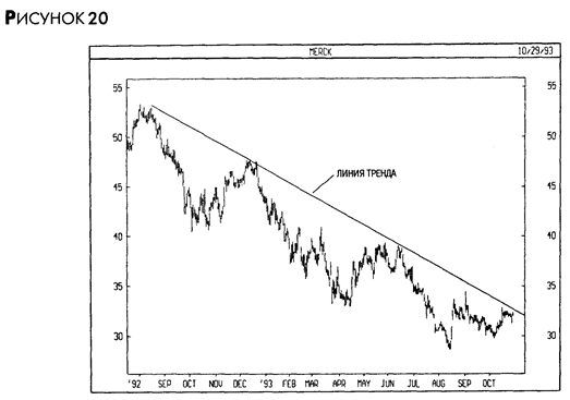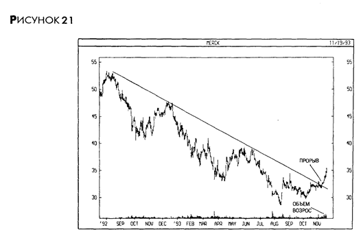 Цены могут прорывать восходящие и нисходящие линии тренда точно так же, как уровни поддержки и сопротивления при изменении ожиданий инвесторов. На рисунке 21 (график курса акций компании Меrсx показан прорыв нисходящей линии тренда, вызванный уверенностью инвесторов в прекращении падения цен.