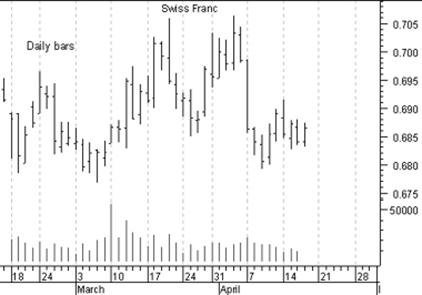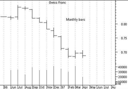 Основные принципы технического анализа неизменны и не зависят от периодичности данных на вашем графике (будь то часовой, дневной, недельный, месячный график и т.д.). В этом можно легко убедиться, взглянув на графики цен контракта на швейцарский франк, представленные на рисунках 40, 41 и 42.