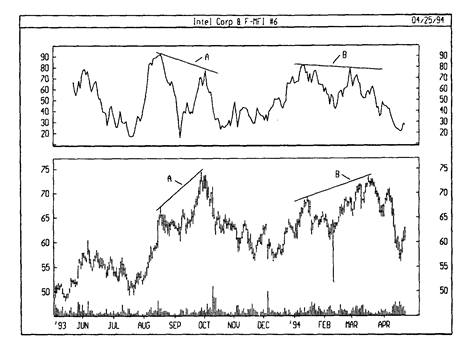 На следующем рисунке представлены графики курса акций Intel и 14дневного индекса денежных потоков. Расхождения в областях А и В послужили четкими опережающими сигналами разворотов цен.