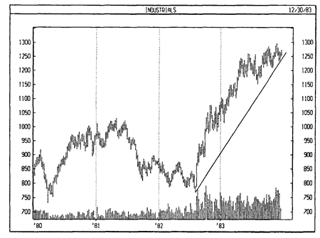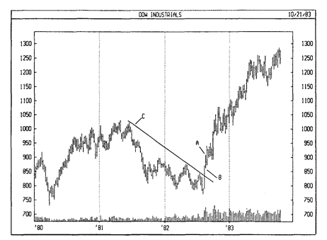 На следующем графике видно, как промышленный индекс ДоуДжонса преодолел уровни предыдущего пика (точка А) и предыдущей впадины (точка В), что означало разворот нисходящей тенденции [линия С).