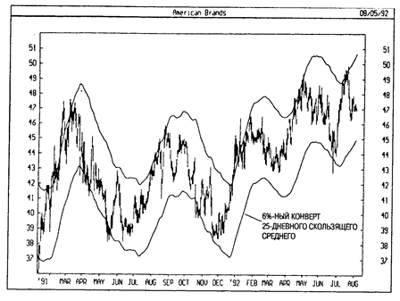 На следующем рисунке показаны график курса акций American Brands и 6%ный конверт 25дневного экспоненциального скользящего среднего. Обратите внимание, что цена чаще отражается от границ конверта, чем прорывает их.