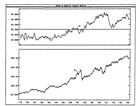 В точке А коэффициент коротких продаж публикой опустился ниже 25% и оказался на медвежьей территории. В течение следующих нескольких месяцев PSR продолжал опускаться по мере усиления бычьих настроений широкой публики. В этот период цены быстро росли, подогревая неистовство покупателей. Последовавший за этим крах 1987 года вернул публику к жестокой реальности.