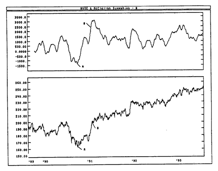 На следующем рисунке показаны графики индекса суммирования Макклеллана и индекса Ньюйоркской фондовой биржи. В точке А индекс суммирования опустился ниже 1300. Это означало окончание длительной нисходящей тенденции. Буквой В отмечено начало сильного бычьего рынка: индекс суммирования превысил +1900 после подъема более чем на 3600 пунктов от предыдущего минимума.