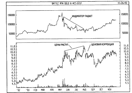 На следующем рисунке представлены графики курса акций Battle Mountain Gold и индикатора накопления/распределения. Здесь налицо медвежье расхождение: в конце июля цены достигли новых максимумов, а индикатор падал. В результате произошла коррекция цен в направлении тенденции индикатора.