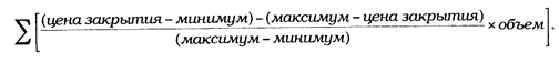 К текущему накопленному значению индикатора прибавляется или вычитается из него определенная доля дневного объема. Чем ближе цена закрытия к максимуму дня, тем больше прибавляемая доля. Чем ближе цена закрытия к минимуму дня, тем больше вычитаемая доля. Если цена закрытия находится строго между максимумом и минимумом, значение индикатора не изменяется.