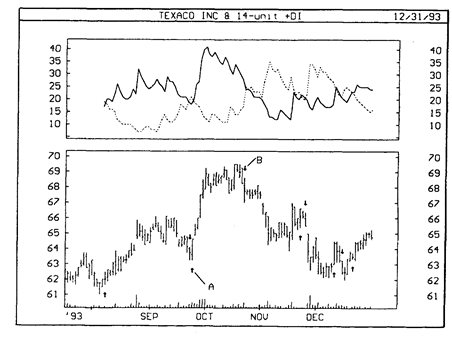 На следующем рисунке представлены графики курса акций Техасo и индикаторов +DI и DI. Стрелками «покупка» отмечены места, где +DI поднимается выше DI, а стрелками «продажа» — где +DI опускается ниже DI.