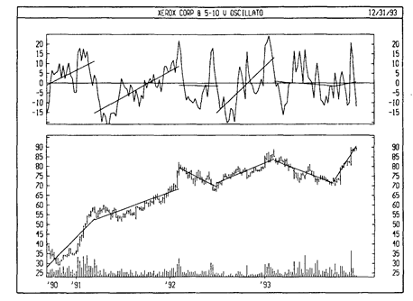 На следующем рисунке представлены графики курса акций Хегох и 5/ 10недельного осциллятора объема. На оба графика нанесены линии тренда линейной регрессии (см. стр. 90).