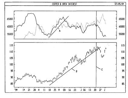 Линия тренда А соответствует одновременному росту открытого интереса и объема. Это подтвердило восходящую тенденцию цен, обозначенную линией тренда В.