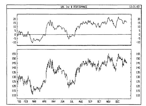 На следующем рисунке представлены графики курса акций United Airlines и индикатора относительного изменения. Судя по показаниям индикатора, курс акций вырос на 16% с начала 1993 года.
