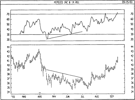 На следующем рисунке представлены графики курса акций PepsiCo и 14дневного RSI. В мае июне сформировалось бычье расхождение: