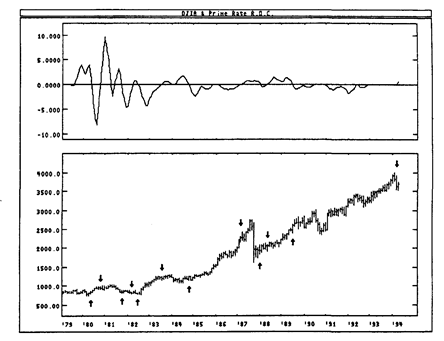 На следующем рисунке показаны графики промышленного индекса ДоуДжонса и 4месячного индикатора скорости изменения базисной процентной ставки. Стрелками «покупка» обозначены моменты снижения процентных ставок (индикатор опускается ниже нулевого уровня), а стрелками «продажа» — моменты, когда процентные ставки повышались. Данный пример демонстрирует наличие сильной корреляции между процентными ставками и рынком акций.
