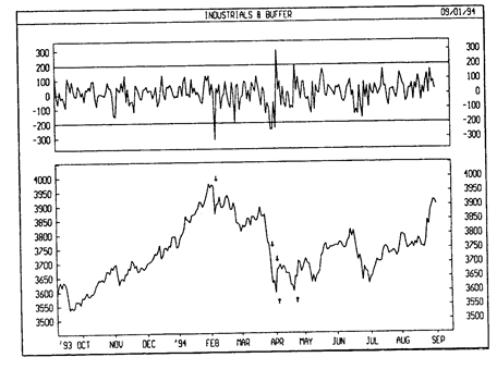На следующем рисунке представлены графики промышленного индекса ДоуДжонса и индикатора разности растущего и падающего объема. Стрелками «покупка» на графике индекса отмечены моменты, когда индикатор поднимался выше 200, а стрелками «продажа» — когда он опускался ниже 200.
