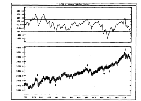 Данный индикатор показывает разность между числом выросших и числом упавших в цене акций. Его значения помогают определить силу рынка в данный день. В дни сильных подъемов индикатор обычно превышает +1000, а в очень слабые дни—опускается ниже -1000.