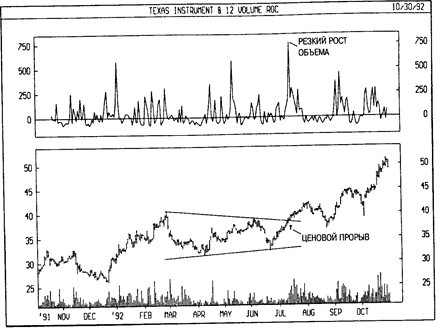На следующем рисунке представлены графики курса акций Texas Instruments и 12дневного индикатора скорости изменения объема. Прорыв цен из треугольника сопровождался резким увеличением объема. Это увеличение объема подтвердило значимость ценового прорыва.
