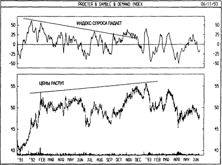 На следующем рисунке представлены графики курса акций Procter & Gamble и индекса спроса. Длительное медвежье расхождение сформировалось в 1992 году, когда цены продолжали расти, а индекс падал. Согласно правилу Сиббета, это признак важной вершины.