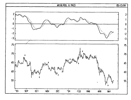 На следующем рисунке представлены графики курса акций Whirlpool и индикатора MACD. Стрелками «покупка» обозначены места, где MACD поднимается выше своей сигнальной линии, а стрелками «продажа» — где MACD опускается ниже сигнальной линии.