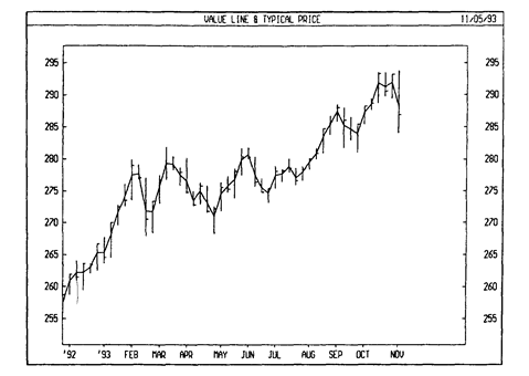 На следующем рисунке представлен график индикатора типичной цены, нанесенный на обычный столбиковый график индекса Value Line's