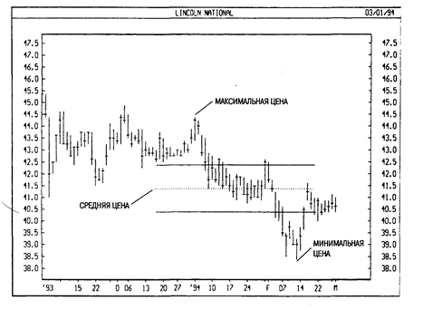 На следующем рисунке линии Тироне построены методом средней точки на графике курса акций Lincoln National. Пунктиром обозначена средняя цена. Верхняя и нижняя линии делят диапазон между максимумом и минимумом на три равные части.