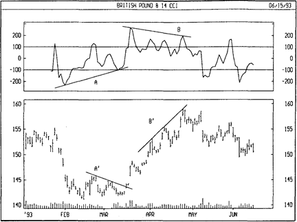 На следующем рисунке показаны графики курса британского фунта и 14дневного CCI. В области А образовалось бычье расхождение (цены падали, а CCI повышался), за которым последовал подъем цен. В области В возникло медвежье расхождение (цены росли при одновременном падении CCI). В результате произошел корректирующий спад. Заметьте, что эти расхождения образовались в областях экстремальных значений индикатора (ниже 100 и выше +100), что придает им дополнительную значимость.
