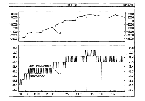 На следующем рисунке показаны тиковый график курса акций IBM и график TVI. В течение 45 минут до точки А цены были зажаты в узком коридоре между ценой спроса 69 1/4 и ценой предложения 69 3/8. В тот же период TVI рос, указывая на медленное накопление акций.