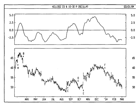 На следующем рисунке показаны графики курса акций Kellogg и 10/ 30дневного ценового осциллятора. В данном примере разность между двумя скользящими средними выражена в процентах.