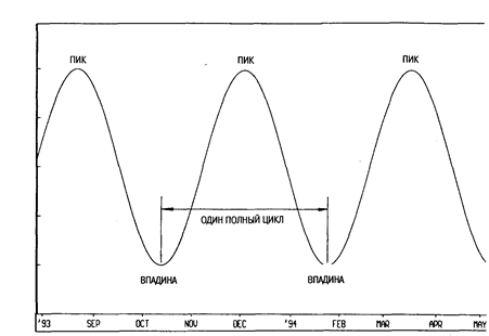 Известно, что цена отражает совпадение ожиданий участников рынка. Эти ожидания постоянно изменяются, вызывая смещение линий спроса и предложения (см. стр. 16) и заставляя цены колебаться между уровнями перекупленности и перепроданное™. Таким образом, колебания цен — это естественный процесс перемены ожиданий, закономерным следствием которого является цикличность.