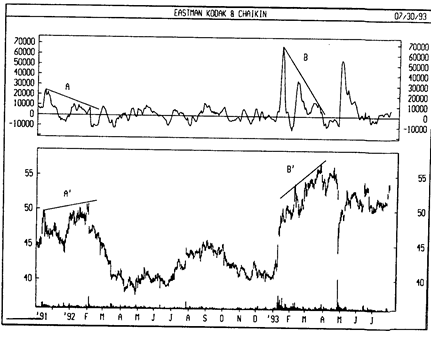 На следующем рисунке показаны графики курса акций Eastman Kodak и осциллятора Чайкина. В областях А и В возникли медвежьи расхождения (цены достигли новых максимумов, а осциллятор падал), предупреждавшие о возможном падении цен. Это в действительности I произошло в обоих случаях.
