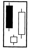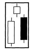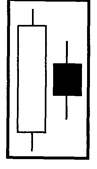 Харами (Harami ("pregnant" in English)). Эта модель (в переводе «беременная») указывает на ослабление темпа ценовой тенденции. Она образуется, когда свеча с маленьким телом оказывается в пределах сравнительного большего тела предыдущей свечи. В данном примере за бычьей (белой) свечой с длинным телом следует слабая медвежья (черная) свеча, что означает замедление темпа восходящей тенденции.