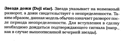 Звезда дожи (Doji star). Звезда указывает на возможный разворот, а дожи свидетельствует о неопределенности. Таким образом, данная модель обычно означает разворот после периода неопределенности. Для вступления в сделку необходимо дождаться подтверждающего сигнала (напр., как в случае вышеописанной вечерней звезды).