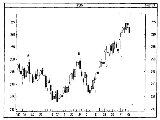 Следующий график цен на кукурузу иллюстрирует несколько свечных моделей и принципы их использования.