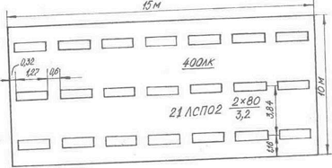 Рис. 1.1. Схема размещения светильников типа ЛСП02 - 2х80 в компьютерном зале