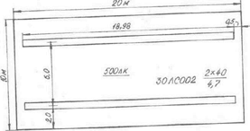 Рис. 1.2. Схема размещения светильников типа ЛС002 – 2х40 в учебном помещении