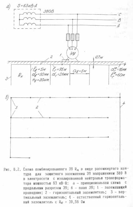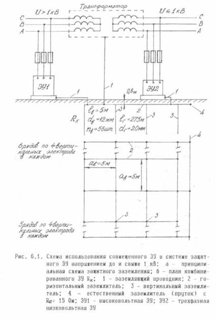 1) присоединение корпусов злектромашин, трансформаторов, аппаратов, светильников и т.п., металических корпусов передвижных и переносных ЭУ и т.д. (детально см. 1.7.46 ПУЭ) к ЗУ Rк (см. рис. 6.1 или 6.2) при помощи заземляющего проводника сечением не менее указанного в табл. 6.1; 2) расположение ЗУ, как правило, в непосредственной близости от ЭУ, ЭО или около стен здания, в котором находится эта ЭУ. Оно должно состоять из естественных и искусственных заземлителей. При этом в качестве естественных заземлителей следует использовать проложенные в земле водопроводные и другие металлические трубопроводы (за исключением трубопроводов горючих жидкостей, горючих или взрывчатых газов и смесей), обсадные трубы скважин, металлические и железобетонные конструкции зданий и сооружений, нахо-