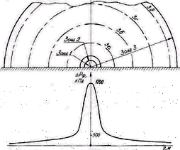 В наземном очаге взрыва ГВС подразделяют три полусферические зоны (рис. 9.1).