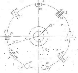 Рис. 9.2. Результаты погнозирования и оценки возможных пос- ледствий наземного взрыва ГВС: r1, r2 - радиусы зон 1 и 2; 2 радиус зоны 3 (расстояние от центра взрыва до объекта, заданное в варианте); 1, 10, 13, 14, 21, 23, 24 и 25 - номера объектов по табл. 9.1;