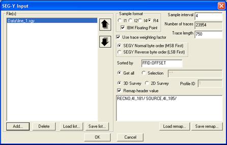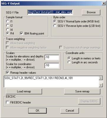 Если некоторые параметры заголовков вводимых сейсмограмм записаны в резервные поля, то при вводе следует задать их переопределения (Remap header value)