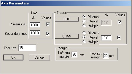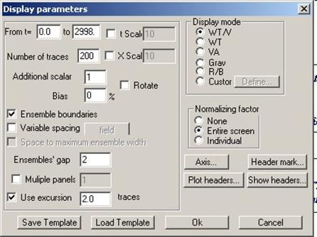 Основное окно имеет 4 вкладки (Axis, Header mar…, Plot headers…, Show headers…), постоянно используемым из которых является окно Axis (рис. 4.6.). В нём параметры визуализации сейсмограмм и временных разрезов: