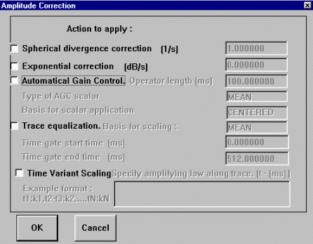 Опция Time variant scaling (переменное во времени усиление) определяет закон усиления амплитуды вдоль трассы. Активировав опцию, в окне необходимо задать пары время-усиление. Порядок записи следующий: